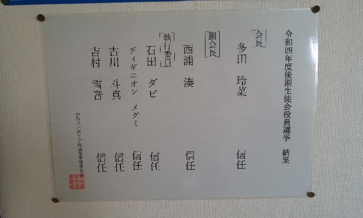 25日(火)の6限目に、後期生徒会役員選挙の立会演説会と投開票が行われました。立会演説会では、どの候補者・応援者の話からも、もっと学校を楽しくしたいという思いを感じられてとても頼もしく感じました。今回の選挙では、会長・副会長・執行委員共に、信任投票となり、全候補者が信任をされました。今後は、この役員さんたちが、南郊中学校の顔として、校内だけではなく校外でも様々な活動の中心となってくれます。みんなの力で、学校をもっと楽しく、よりみんなが安心できる場にしていきましょう!