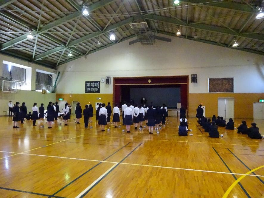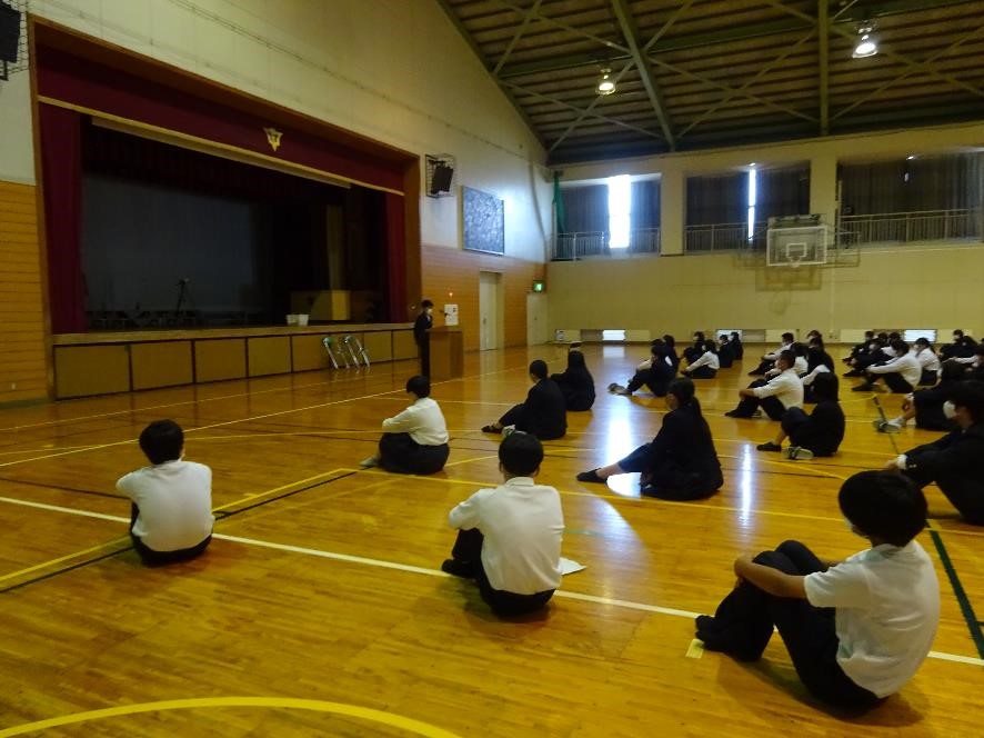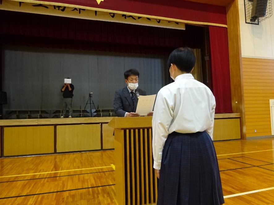 新型コロナウイルス感染症の拡大状況を考え、集会形式を取りやめて、役員のみ体育館に入って、代表1名のみに委嘱状を渡す。後の生徒は、教室にZOOMで映像配信をして、担任の先生から、各クラスで委嘱状を渡してもらうという形式に変更をしました。