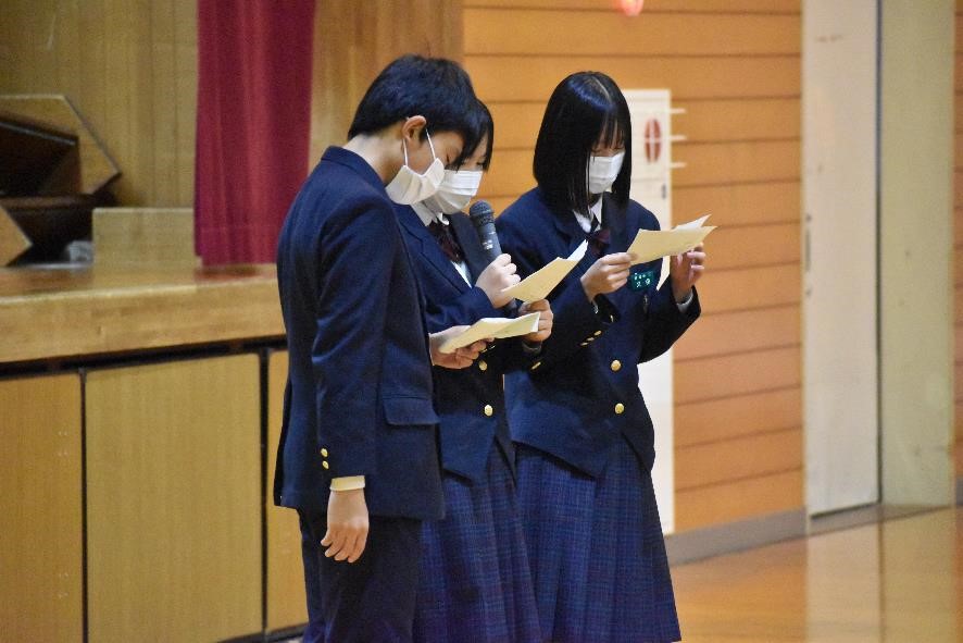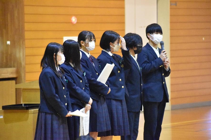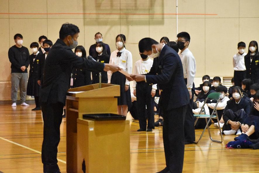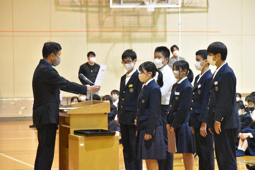 11月1日(火)の6限目に、後期の役員委嘱式を行いました。生徒会執行部、学級役員の順で委嘱状を渡した後、前期生徒会執行部の退任の挨拶、新執行部の挨拶、拡大室長会からピンクシャツ運動の取組についての説明がありました。式全体を通じて、学校をもっとよくしていきたいという思いが伝わる時間でした。役員の皆さんは学校やクラスの顔として、色んなことを発信してくれます。しかし、その人たちだけが頑張っていても、学校は変わりません。「みんなで創る学校」の意味をしっかりと考えて、1人ひとりができることをやっていきたいと思います。