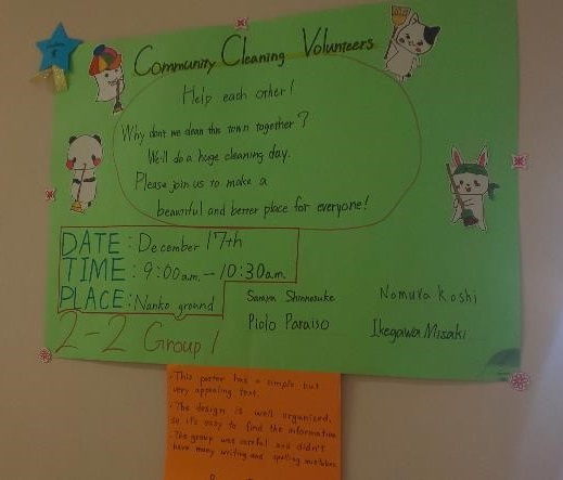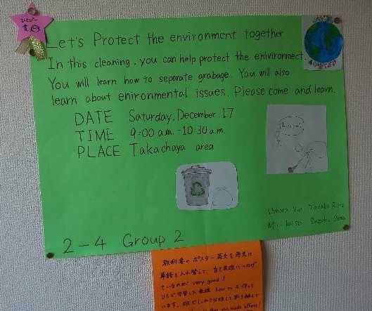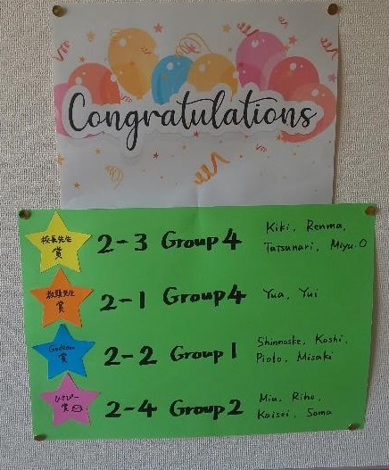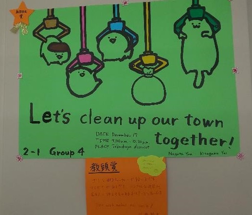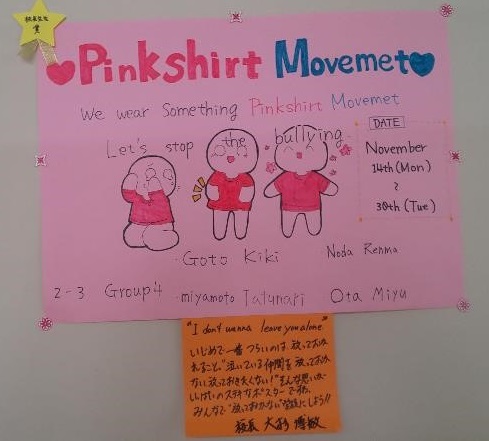 今、本校の校舎内には、色んなところに、英語で書かれたピンクと緑のポスターが貼られています。2年生の英語の授業で取り組んだもので、今行っているピンクシャツ運動と、生徒会中心に12/17に実施予定の地域清掃ボランティアを盛り上げるためのポスターを、グループごとに作ってくれました。ピンクがピンクシャツ運動、緑が地域清掃ボランティアのポスターです。私も、作っている授業を見に行きましたが、子どもたちが本当に楽しそうに、単語を調べたり、英文をつくったりしている姿を見て、とても嬉しくなりました。力作ぞろいの中で、賞にれらばれた作品を紹介します。