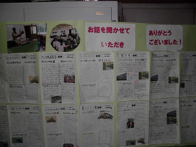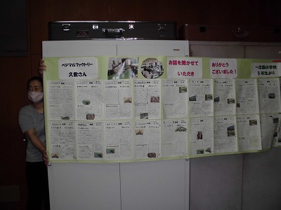 5年生がベジマルさんとの出会いで学んだことを新聞に書きあげました。発見したことや働く人の思いに共感したことなどが綴られています。この新聞をベジマルさんに届けるとのこと。こうやって、人とのつながりはもちろん、地域を誇りに思ったり大切に思ったりする心が育まれていくのですネ!全員分は無理なので、模造紙2枚に貼れる分だけ、お届けすることに!ベジマルさんの工場に掲示してくださるそうです。『従業員にとっても、励みになります』と言っていただき、うれしい限りです。  |