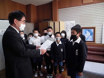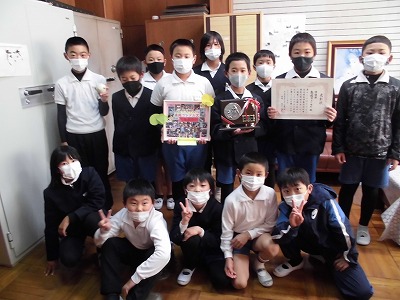 14日(火)お昼休みの時間、スポ少のコンドルズのメンバーが校長室へ約束通りにやってきました。約束通りというのは、ちゃんとアポも取って、礼儀正しく、ミニ表彰式にやってきたのです! 新メンバーで挑んだ大会で準優勝を収めたということで、賞状と盾を見せに来てくれたのです。 賞状です! 代読して渡しました。 盾です! ずっしり重かったです! みんながきびきびと動き、会話もはきはきとしており、気持ちよい式となりました!記念撮影をしました。部員募集の案内板もちゃっかり手にしており、すばらしいことこの上なしです! 今後の活躍も期待大です! |
