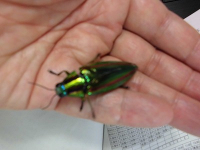 まずは、このまばゆいばかりの輝きをご覧あれ! 3年生の児童が近所の方に頂いたということで、学校へ持ってきてくれました。こちらの腹側から見て、ピンときた方はなかなかの虫博士! この虫は、翠の輝きが魅力となっています。 そうです、玉虫(タマムシ)です。 翠の輝きの中に、赤や青の筋が入り、 輝きに神秘さが加わります。 6年生が修学旅行で行く法隆寺の国宝に「玉虫厨子(たまむしのずし)」という仏教工芸品があり、そこにタマムシの羽が使われていることが知られています。 7世紀の作品ですよ! 子どもたちは、今はやりのゲームのレアアイテムということで知っているようで・・これまた驚きです!。 |
