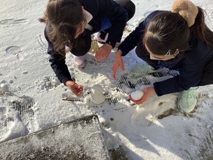 2月9日(月)昨日から降り続いた雪で、朝は、道路も屋根も、一面真っ白となりました。子どもたちは大はしゃぎの朝でした。道路の積雪、凍結で大人は、びくびくしながらの車の運転だったと思います。通学路も凍結していたところがあり、保護者の方にはご心配をおかけし、登校に付き添っていただいた方もありました。ありがとうございました。運動場は、うっすら積もっていたので、子どもたちは、雪をかき集め、雪合戦したり、雪だるまを作ったりと楽しめた子もたくさんいたようです。短い時間でも、先生や友達と雪を投げ合って雪合戦を楽しんだ学級もありました。