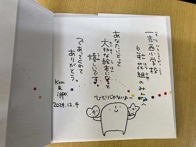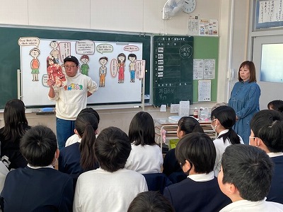 いっぽさんとこんちゃんから、これまでの生活といろいろな人との出会いを通じて得た経験や気づきを6年生にわかりやすく教えてくださいました。