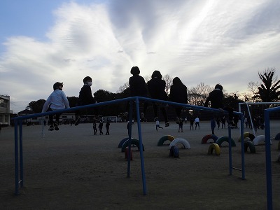 石橋駅付近での近鉄電車との出会い、これも楽しみの一つです。桜が咲いたときの風景は最高です! 白菜の収穫が終盤を迎えていました。車窓からの眺めは、季節のうつろいや人の営みが肌で感じられ、心がとても落ち着きます。この気持ちの共有を子どもたちと話せるといいんですがね・・。でも、今は黙って乗らねば・・。 大井と井生が2便になったことで、バス同士がすれ違う場面がうまれました。仲間意識というか、つながり感が味わえ、それはそれでワクワクして楽しいです! こちらは、おまけの写真です。バスから降りて、校舎へ向かう途中、元気に遊ぶ子どもたちから「校長先生、おはようございまーす!」とたくさんのあいさつを受けます。声とともに、ユニークな姿もいっぱい見せてもらっています。この写真、雲梯に腰掛ける子どもたちと雲が妙にマッチして、思わず ほっこり・にっこり です! |