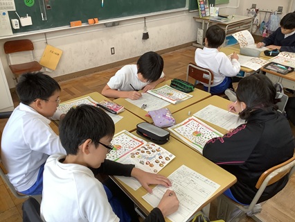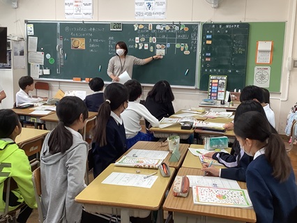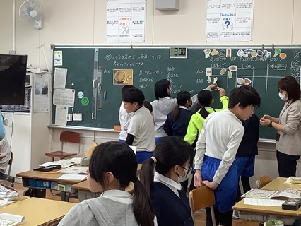 10月31日(金)5年生は、バランスのよい食事について考える授業を栄養教諭の先生にしていただきました。栄養教諭の先生は、普段は給食センターで勤務していて、食育の授業をしに学校に来てくれます。給食の献立も考えてくれています。