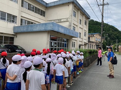 まずは、フィールドワークです。旧大井小学校~昔商店が並んでいたところ~雲出川~大井公民館とぐるりとご案内いただきました。とくに、各家庭の水道の水が雲出川の水であることや、大井地区には機関車が走っていたことに子どもたちは驚いていました。