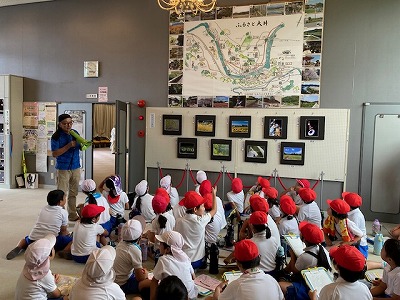 大井公民館では、伊勢野さんに地図を示しながらご説明いただいた後、「大井という名前はどうしてついたのですか?」「大井地区の特産物は何ですか?」など、子どもたちからのたくさんの質問にお答えいただきました。