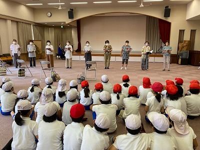 最後に公民館講座で活動していらっしゃるアンサンブルコーラスのみなさんに「海」「虫の声」の2曲をご披露いただきました。きれいな歌声に魅了された子どもたちでした。