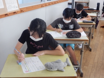 夏休みに頑張った宿題の内容を復習するため、プリントの問題を解いています。