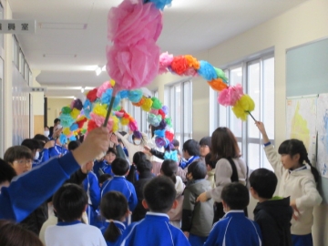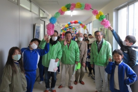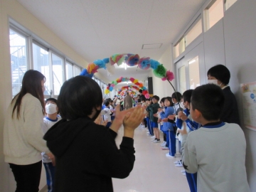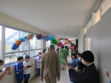 花道をくぐっていただいたあと、代表児童がみんなからのお手紙を渡します。