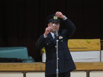 ☆放送後、お互いに譲り合って、静かに体育館に移動することが できました。 ☆最初に、校長先生のお話を聴きました。 ☆津警察から来ていただいた方のお話です。 「今日の放送は聞こえましたか?」 「避難訓練の合言葉?」 学校だけでなく、帰り路についてもお話していただき、防犯ベルに ついてもふれてもらいました。