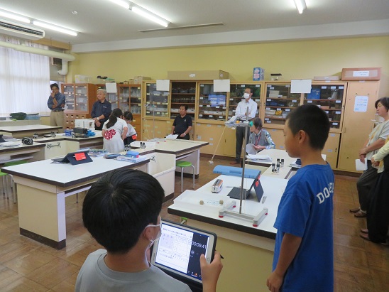 振り子の実験で、ひもの長さをかえると 振れる時間ばどう変わるのか 協力して実験をしていました。