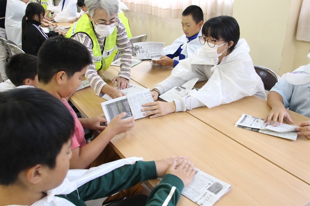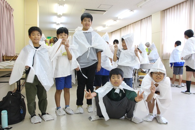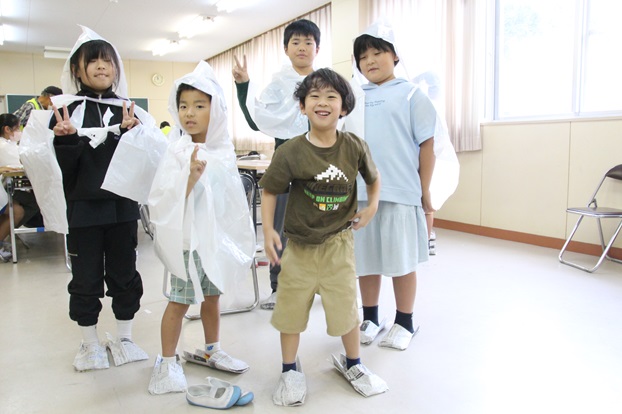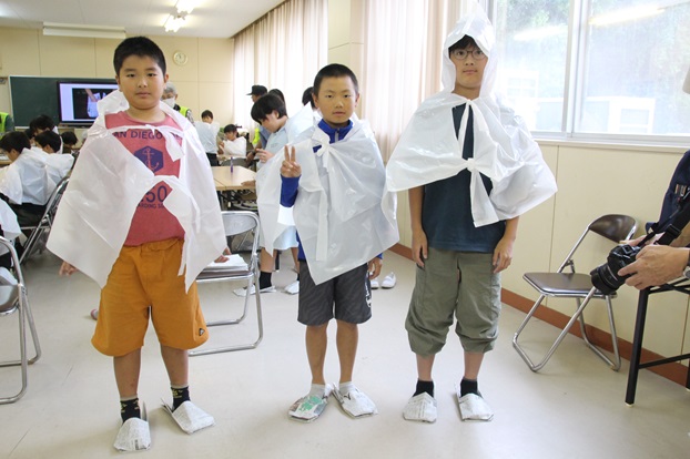 ポンチョを着ながら 新聞紙のスリッパもうまくできたみたいです。
