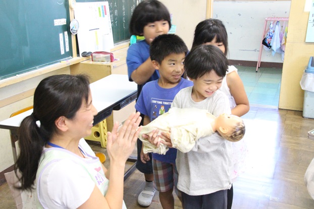 「おもた~い」「緊張する~」と言いながら だっこをする子どもたちです。