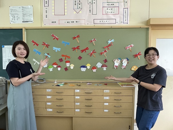 同じころ、図書室では、図書ボランティアのお二人が秋の飾りつけをしてくださっていました。