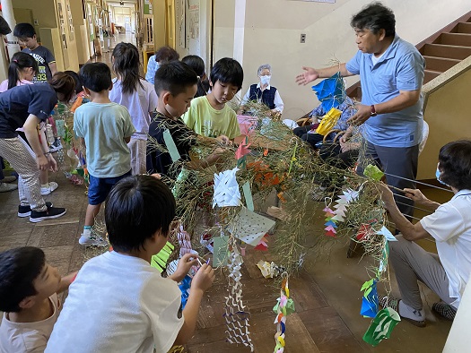 七夕飾りや願い事の短冊を みんなで笹につけていきます。
