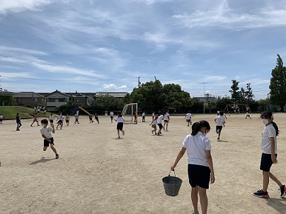 猛暑のなかスタートした2学期ですが、登校初日は子どもたちの活気であふれていました。休み時間、運動場で遊ぶ姿もみられました。