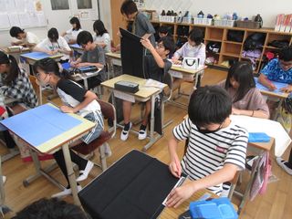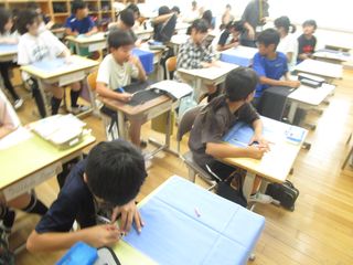 6年生が家庭科で、きんちゃく作りに取り組んでいました。