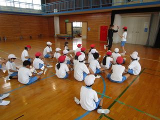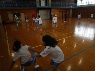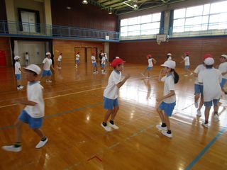 ケンケンでいろいろな人とジャンケンをしたり、ペアーで相手の背中にタッチしたり・・・