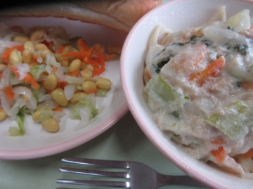 【ツナのクリームソーススパゲッティ 大豆サラダ パン 牛乳】