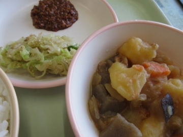 【肉じゃが 納豆みそ ごましおキャベツ 麦飯 牛乳】