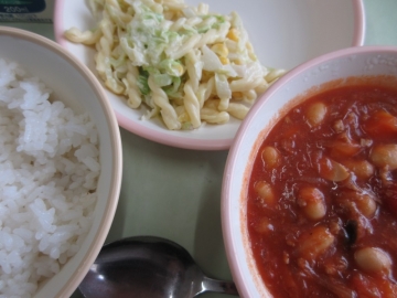 【大豆のチリソース煮 マカロニサラダ 麦飯 牛乳】