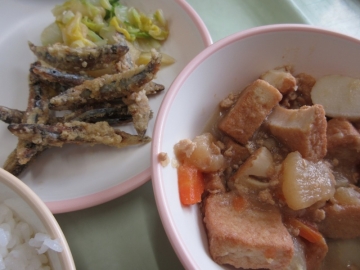 【里芋と大根のそぼろ煮 きびなごのから揚げ 白菜漬け 麦飯 牛乳】