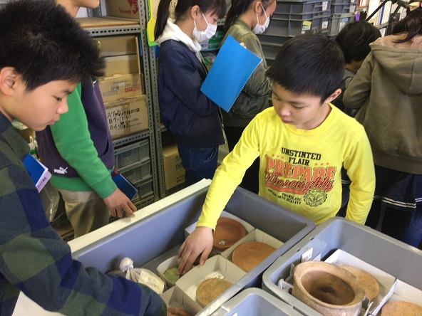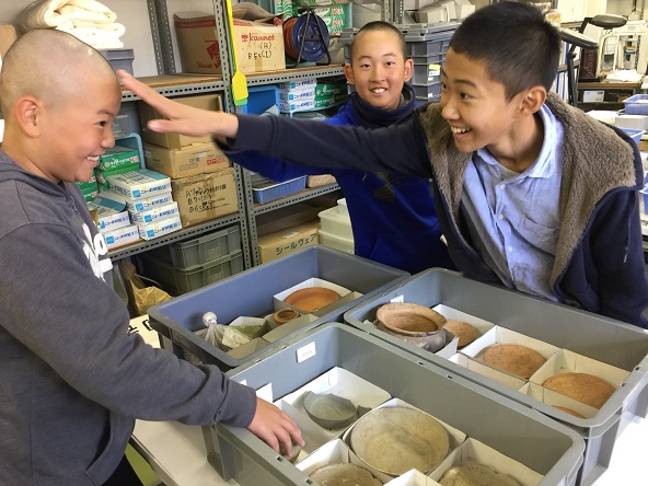 博物館の周りから発掘された土器の破片を洗って、パズルのように貼り合わせて復元していきます。