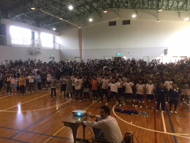 休憩の合間にエビカニクスという体操です。児童会の皆さんが見本をしています。