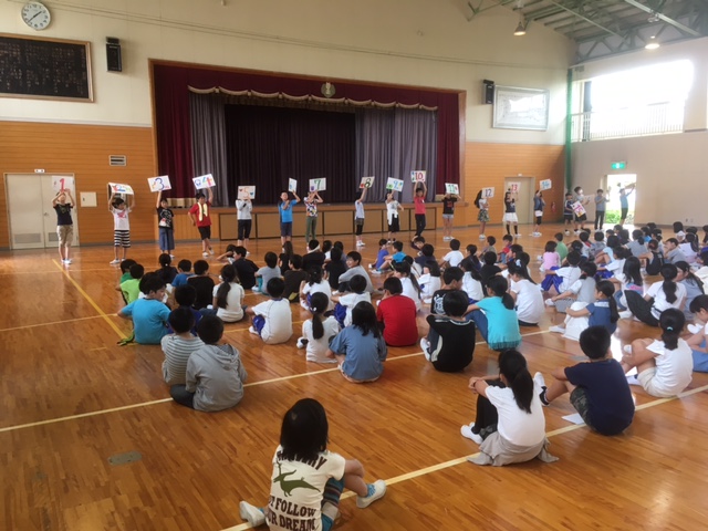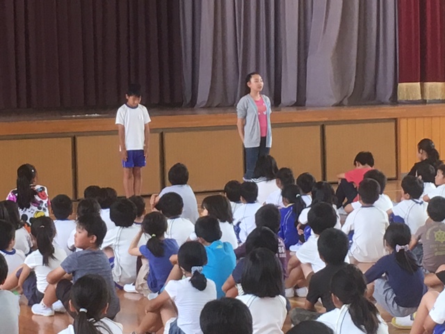 校歌を歌ったあとに、児童会役員さんから、めあてについて発表です。