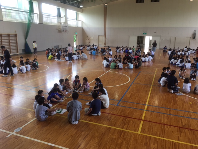 今年度、初めての縦割り班の児童集会なので、班別に並ぶところから始まります。