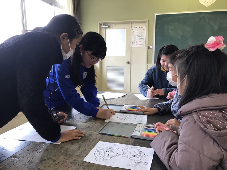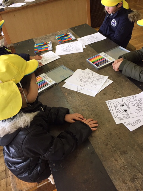 図工室では、塗り絵です。親切な6年生は、名前を一人一人聞いて、書いてあげていました。