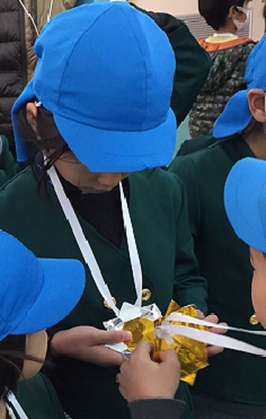最後に6年生が作ったメダルを園児さん全員に、プレゼントしました。もちろん、みんな大喜びでした。