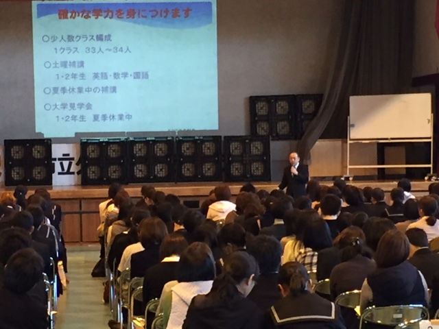 10月31日(火)第3回進路説明会を実施しました。参加者は3年生生徒とその保護者、および1・2年生の保護者の中で希望者のみなさんです。今回は津市内県立高等学校の中から8校の学校に説明をしていただきました。各学校の特色と重点的に取り組んでいる教育内容について説明があり、学校生活を彩る学校行事・部活動も紹介され学校の様子も知ることができました。進路を考えることは自分の将来を考えることにつながります。悩むことも多いとは思いますが、プラス思考で前向きにとらえ、努力を積み重ねてほしいと願います。