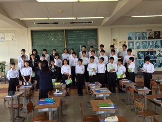 今日は5人の『うたおに』の皆さんが来校され、各学級で個別に指導していただきました。県下各地で精力的にコンサート活動をして見える合唱団の皆さんに、直接指導していただき生徒の合唱に対する意欲がさらに増し、素晴らしい合唱を作ろうとする気持ちが高まりました。