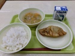 今日の献立は、津ギョウザ、春雨スープ、麦飯、牛乳でした。
