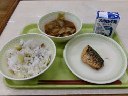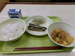 今日の献立は、イワシの甘露煮、じゃがいものそぼろ煮、しそあえ、麦飯、牛乳でした。ごちそうさまでした。