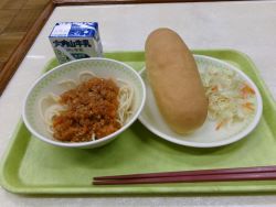 今日の献立は、ミートソーススパゲティ、ドレッシングサラダ、ロールパン、牛乳でした。ごちそうさまでした。