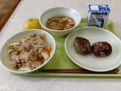 今日の献立は、マコモ入りつくね、美杉みそのみそ汁、みかん、マコモだけとマイタケの炊き込みご飯、牛乳でした。ごちそうさまでした。