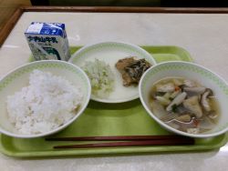 今日の献立は、サバの一味焼き、豚汁、麦飯、牛乳でした。ごちそうさまでした。