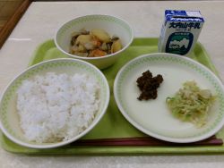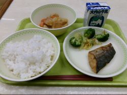 献立は、さわらのみそ焼き、里芋と大根のそぼろ煮、白菜のおかか和え、麦飯、牛乳でした。ごちそうさまでした。