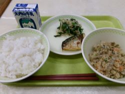 今日の献立は、さばの塩焼き、おからの炒り煮、ほうれんそうのゴマあえ、麦飯、牛乳でした。ごちそうさまでした。