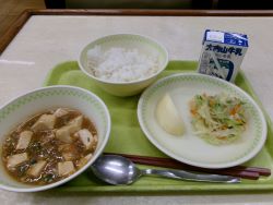 今日の献立は、マーボー豆腐、バンサンスウ、リンゴ、麦飯、牛乳でした。ごちそうさまでした。
