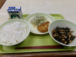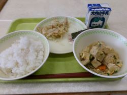 今日の給食は、高野豆腐の卵とじ、れんこんのあえもの、焼きのり、麦飯、牛乳でした。ごちそうさまでした。
