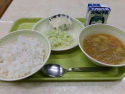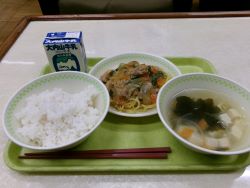 2,3年生は、給食前に調理実習で豚肉の生姜焼きを作って食べていました。すごくいい匂いで、おいしそうでした。その後の給食です。