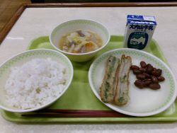 今日の献立は、ちくわのあおのり揚げ、金時豆の甘煮、石狩汁、麦飯、牛乳でした。ごちそうさまでした。