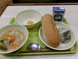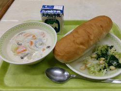 今日の献立は、サーモンチャウダー、アレッタと大豆のサラダ、米粉入りパン、牛乳でした。ごちそうさまでした。