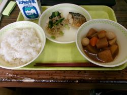 今日の献立は、サバの塩焼き、みそおでん、小松菜ともやしのおかかあえ、麦飯、牛乳でした。ごちそうさまでした。